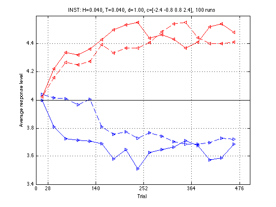 Params: H=0.040, T=0.040, d=1.00, c=[-2.4 -0.8 0.8 2.4], 100 runs ----------------------------------------------------------------- Red line: fdbk1 = +0.67, nofb1 = +0.88, f-n = -0.21 % fdbk 1st Blue line: nofb2 = +0.51, fdbk2 = +0.65, f-n = +0.15 % nofb 1st Interactn: first = +0.16, secnd = -0.22, TTL = -0.06